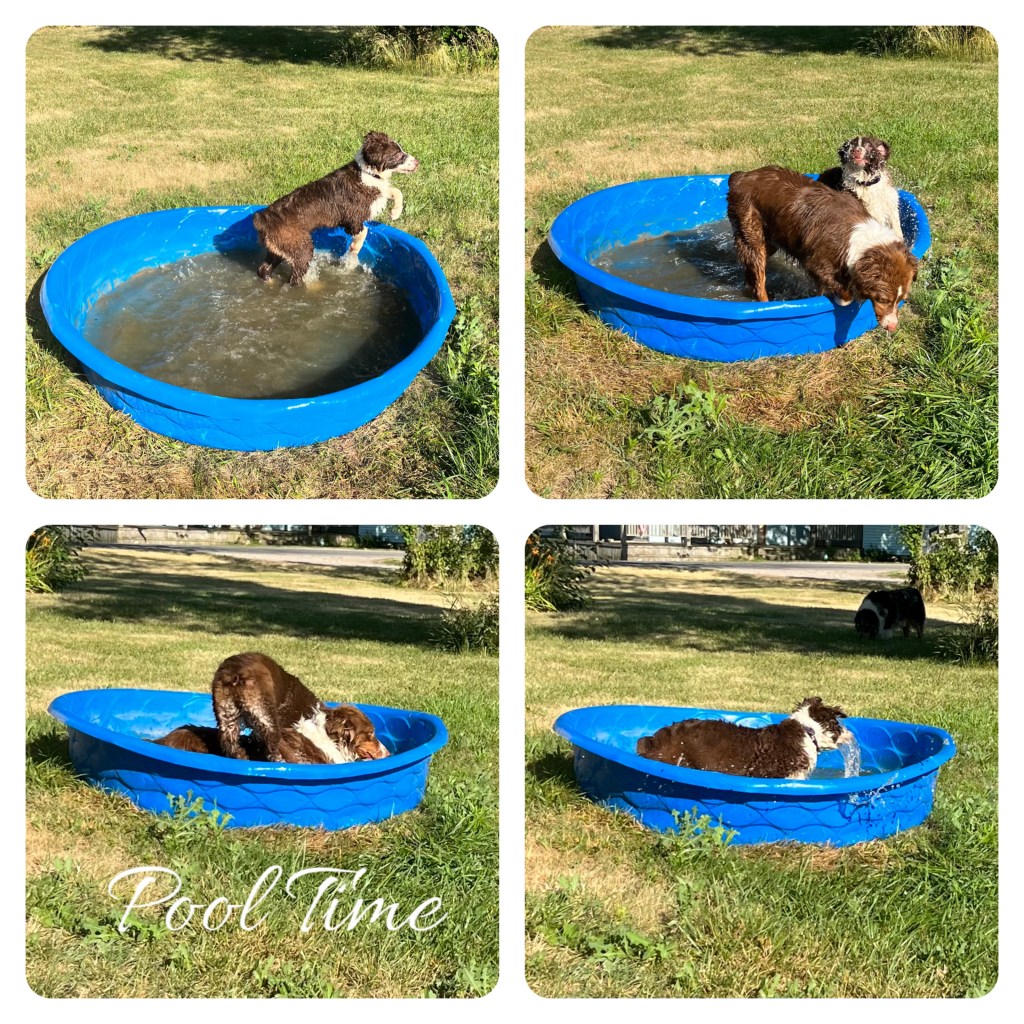 Annie is top left. She is 7 years old. Maverick, blue merle, is also 7.