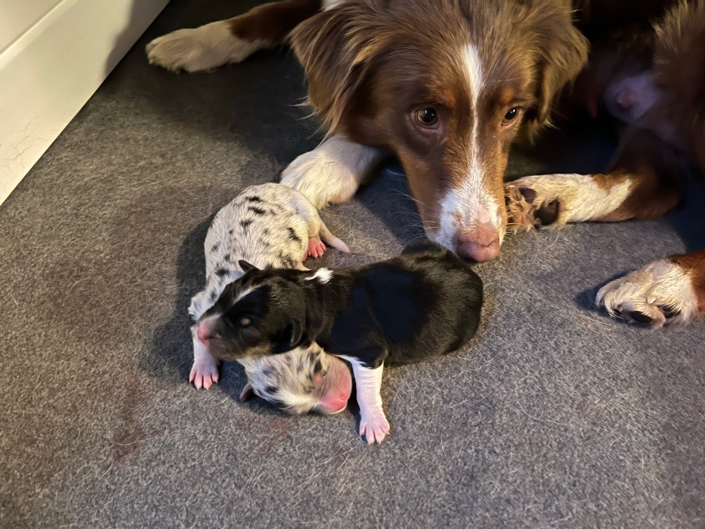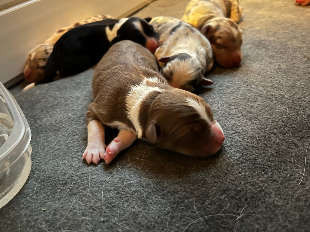 She delivered yesterday, Thanksgiving. Red Merle, male and female; Blue Merle, male and female; Two Black Tri, both are females, and one Red Tri, male