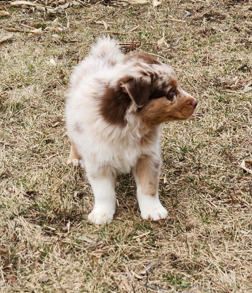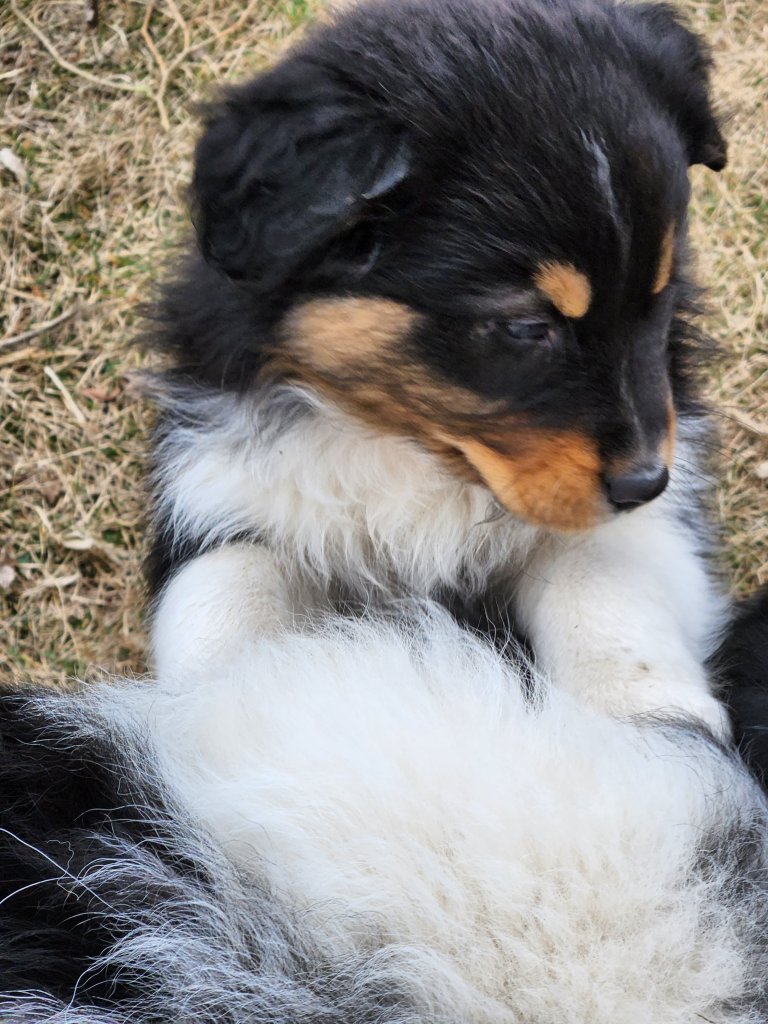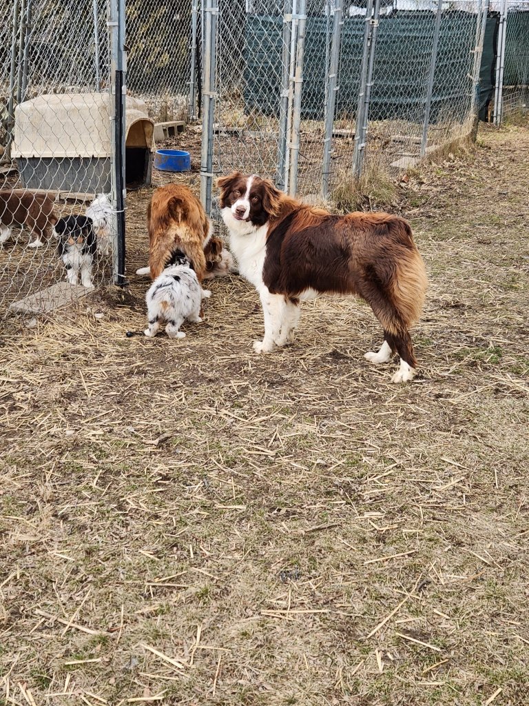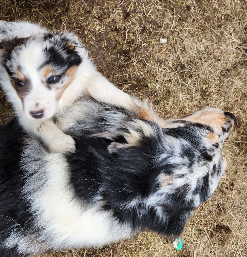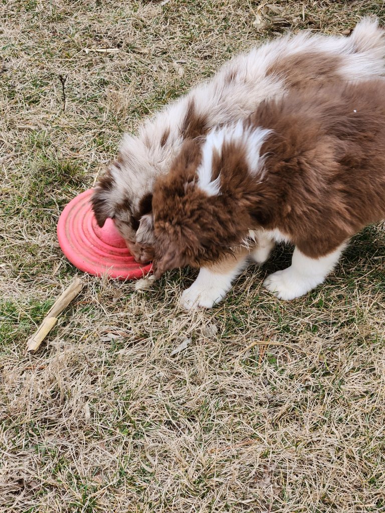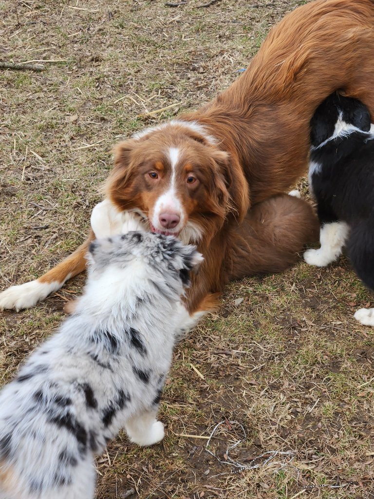 Today, All the adult dogs played with Sweet Pea’s puppies. It was fun watching the adult dogs trying to teach the puppies how to play with the nerf football. Sweet Pea was playing with the puppies, but she was not hurting them. I am also introducing Heidi in this post. She is my newest addition to our Aussie family. She may be pregnant, by Maverick – not sure yet.