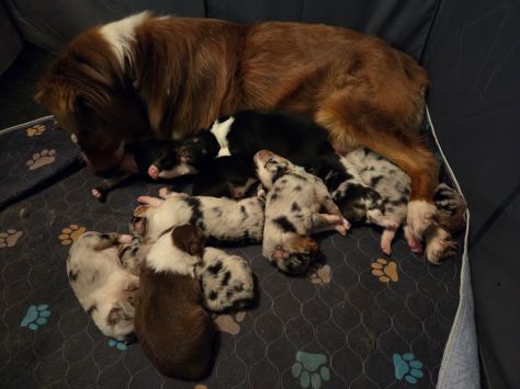 Sweet Pea has 10 puppies which are keeping her pretty busy. They were born on December 12th, 2025. Their eyes recently opened, and they are pretty active. I was amazed at how much energy they had when I started taking their first pics. It is so fun to watch them as they start seeing things for the first time. I have been breeding since 2012. I don’t remember a litter being as content as this one – they seldom cry. It has been like that from day 1. They are just now starting to bark.